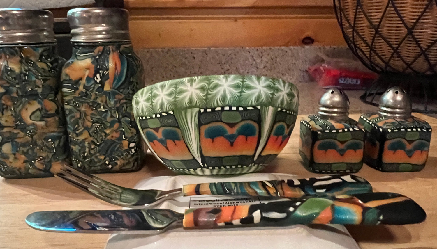 Beautiful polymer clay designs adorn bowls, glassware, flatware and other household items. Add some color to your home. Fun yet functional. No two designs are the same.