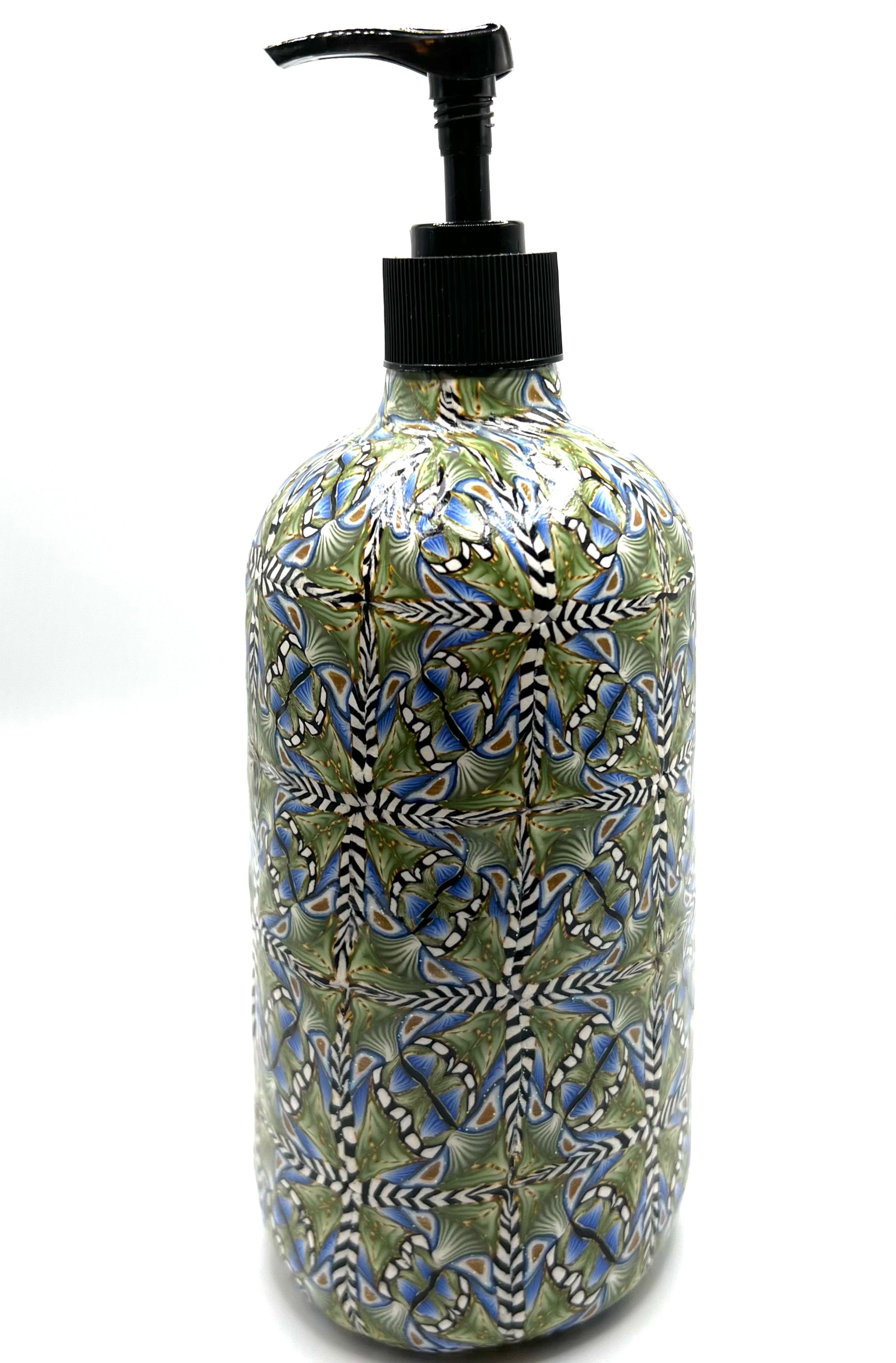 Add a touch of nature to your bathroom or kitchen my Blue and Olive Green Geometric style soap dispenser. Made from durable polymer clay, this unique soap dispenser is covered with a geometric pattern for a pop of color. Elevate your daily routine with this charming addition to your decor!